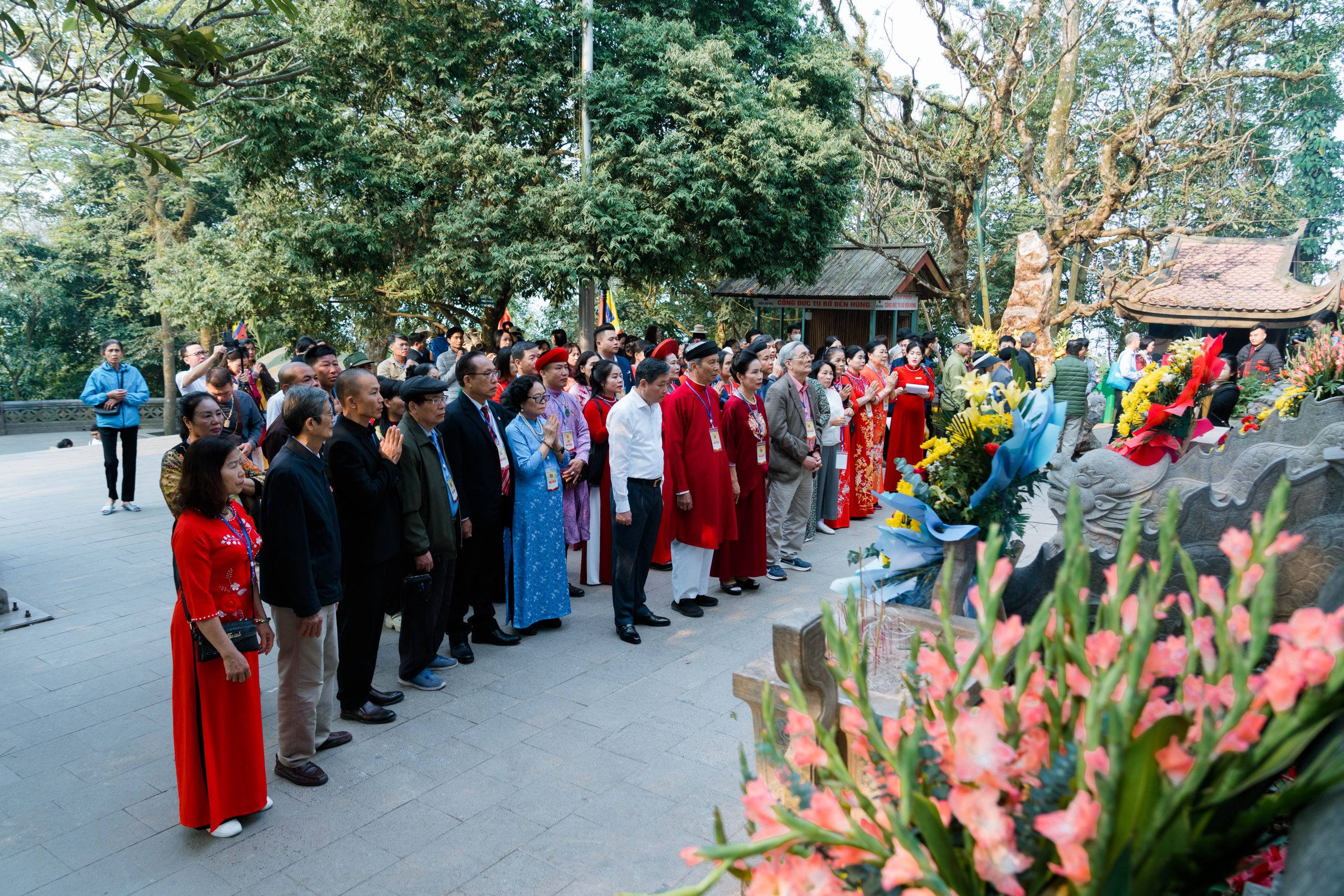 Trong không khí trang nghiêm và thành kính, đoàn đại biểu đã lần lượt dâng hương tại đền Hạ, đền Trung và đặc biệt là tại đền Thượng – nơi linh thiêng bậc nhất của Khu Di tích. Tại đây, đoàn đã kính cẩn dâng hương, hoa tưởng nhớ công đức của các Vua Hùng và thành tâm kính cáo trước anh linh tiên tổ về những thành tựu mà Hội Di sản Văn hóa Việt Nam đã đạt được trong thời gian qua.