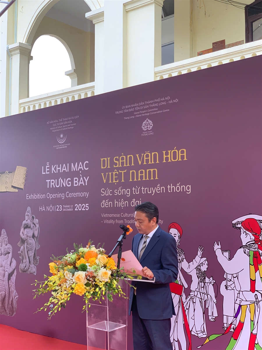Tiếp nối các hoạt động kỷ niệm Ngày Di sản văn hóa Việt Nam – ngày có ý nghĩa quan trọng trong việc tôn vinh các giá trị lịch sử, văn hóa truyền thống của dân tộc, thiết thực chào mừng Đại hội Đại biểu toàn quốc lần thứ XIV của Đảng, sáng ngày 23/12/2025, tại Khu trung tâm Hoàng Thành Thăng Long, Cục Di sản văn hóa chủ trì, phối hợp với Trung tâm Bảo tồn Di sản Thăng Long – Hà Nội và các đơn vị liên quan tổ chức Trưng bày “Di sản văn hóa Việt Nam – Sức sống từ truyền thống đến hiện đại”.