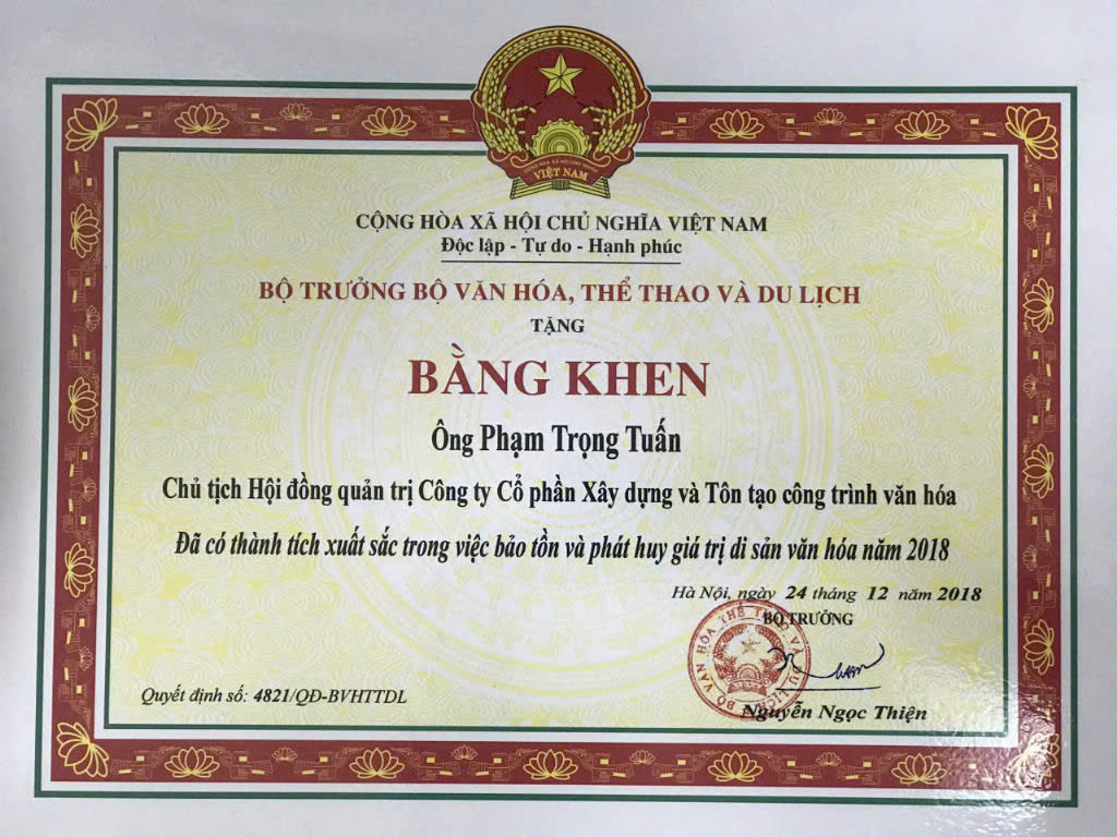 - Bằng khen của Bộ Trưởng Bộ Văn hóa, Thê thao và Du lịch vì đã có thành tích xuất sắc trong việc bảo tồn và phát huy giá trị di sản văn hóa năm 2018.